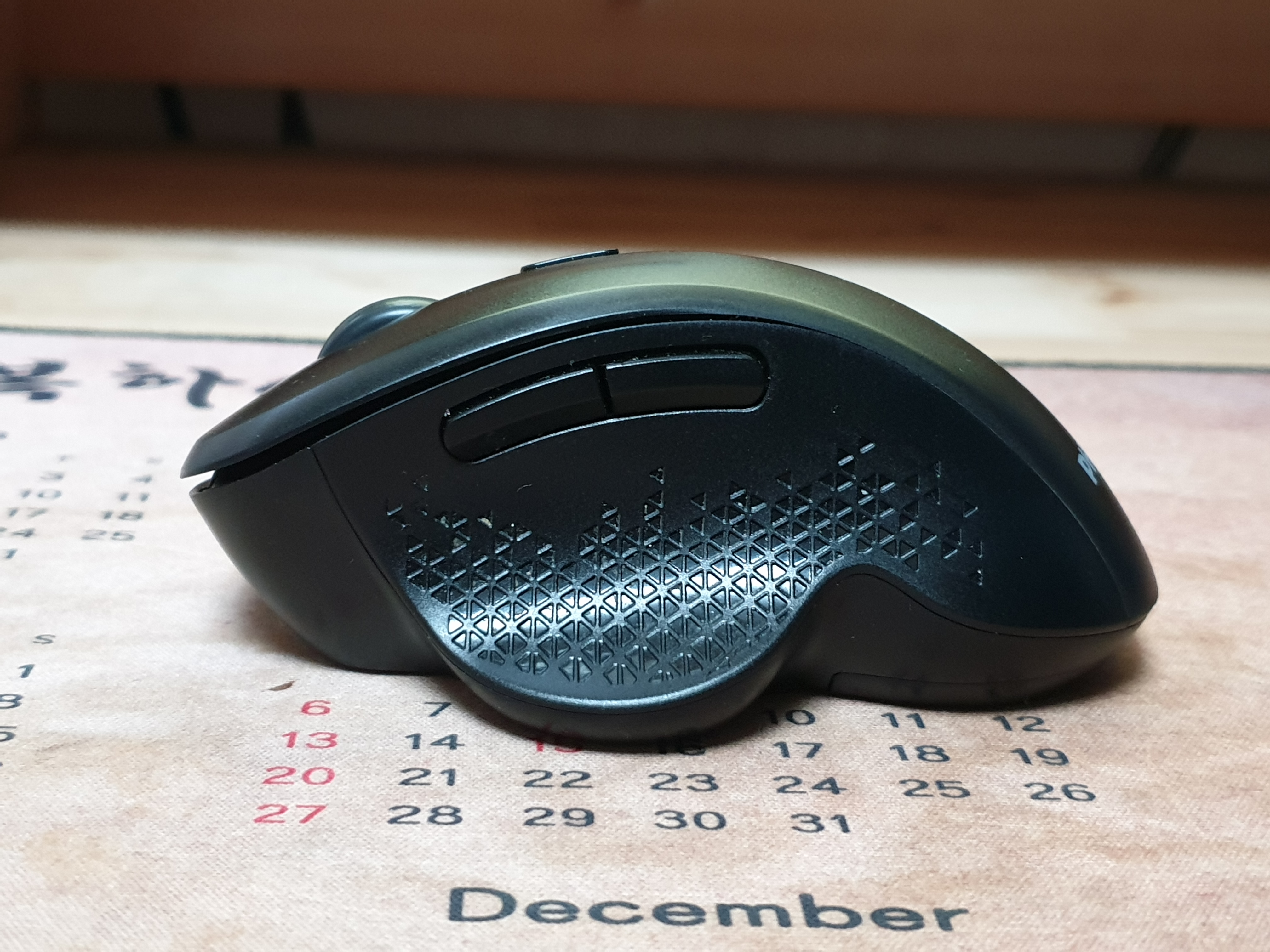일반 마우스와 비교하면 비슷한 모습이지만 오른쪽으로 살짝 기울어져 있고 왼쪽에는 앞, 뒤로 가는 버튼과 엄지손가락이 닿는 부위엔 세모 모양의 무늬를 새겨넣어서 엄지손가락이 미끄러지는 걸 방지해주고 있다.