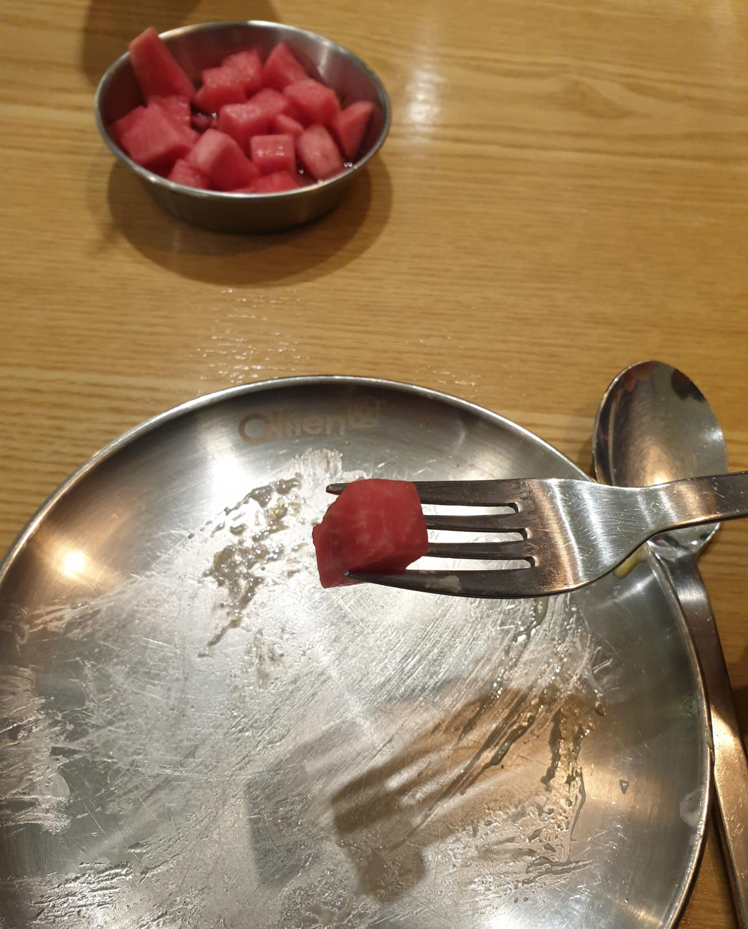 주문을 하고 나서 셀프서비스로 수저와 포크를 서로 나눠갖고 빨간 단무지를 추가로 가지고 왔다.