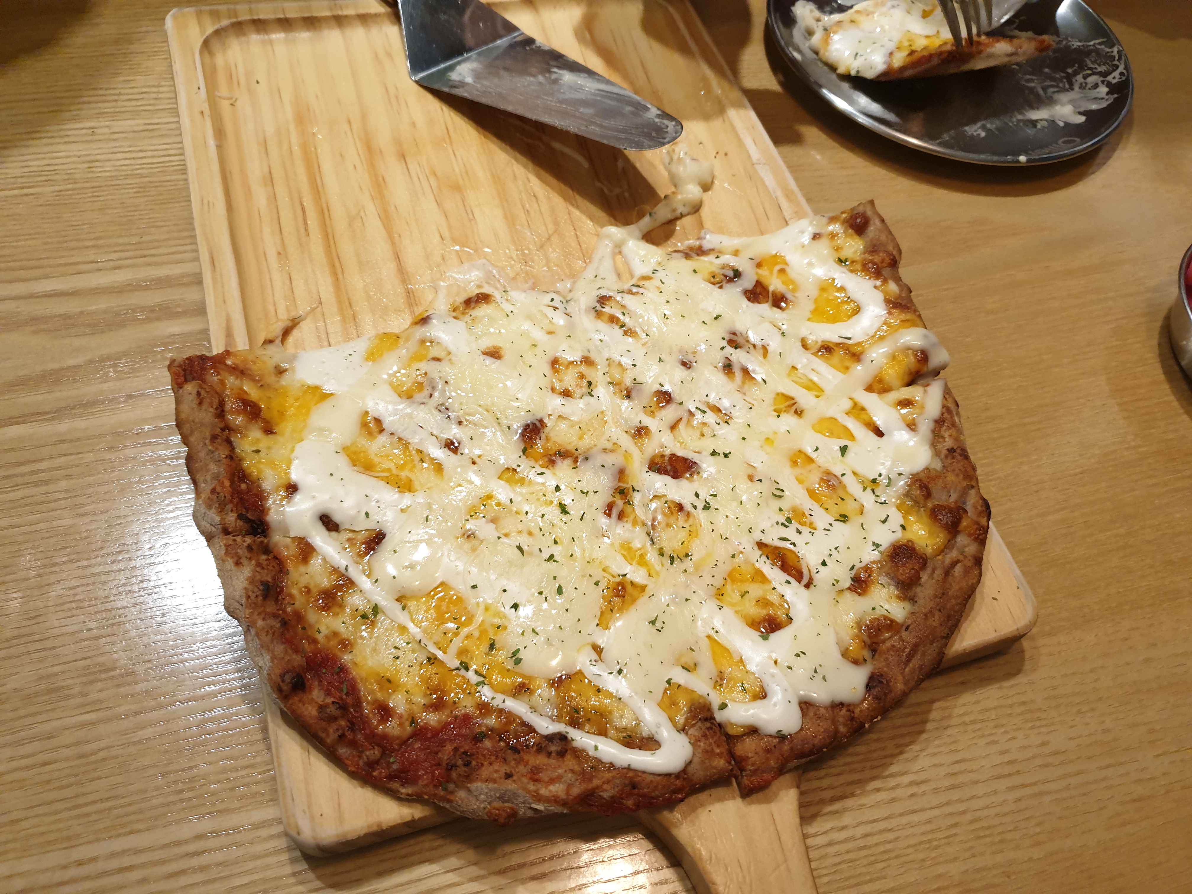 큼직하고 먹음직스러운 스노잉 치즈피자를 보자 식욕이 올라오네