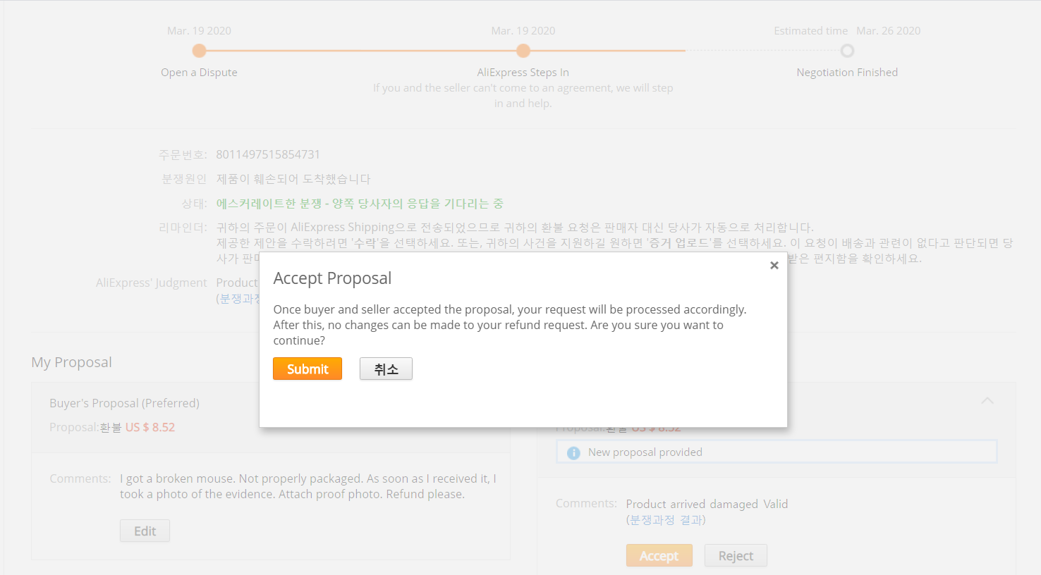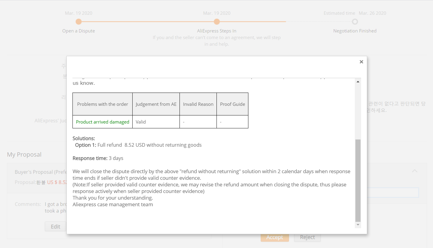알리익스프레스에서 Dispute를 걸면 5일 정도 지난 후 직접 개입해서 물건값을 돌려주던지 혹시 어떤 제시를 해준다고 안 상태로 3월 19일날 신청을 했었다.