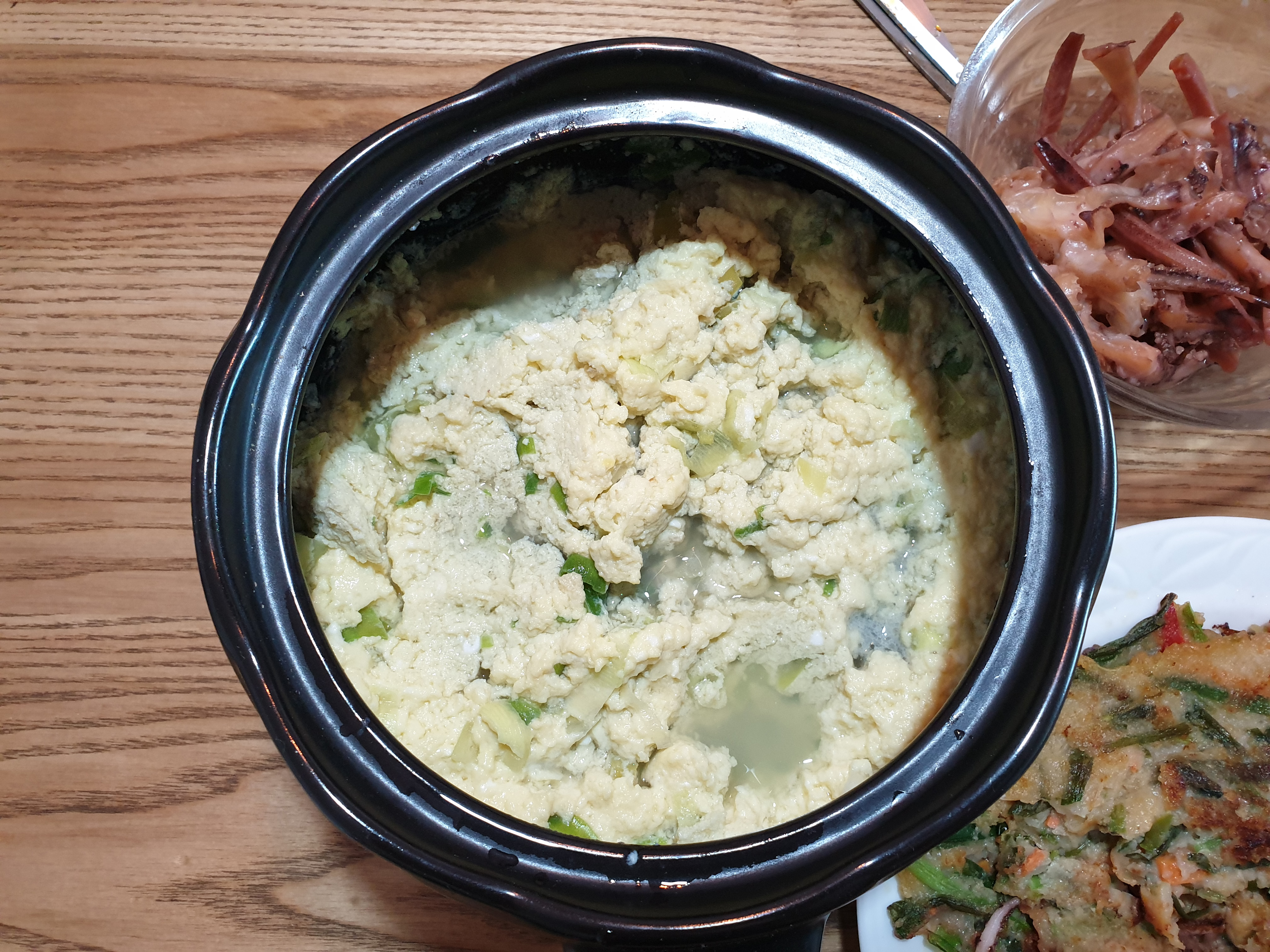 음식 준비를 하다가 보니까 식탁 위에 해물파전과 계란찜이 있어서 물어보니까 어머니께서 만들어 놓으신 음식이라고 한다.