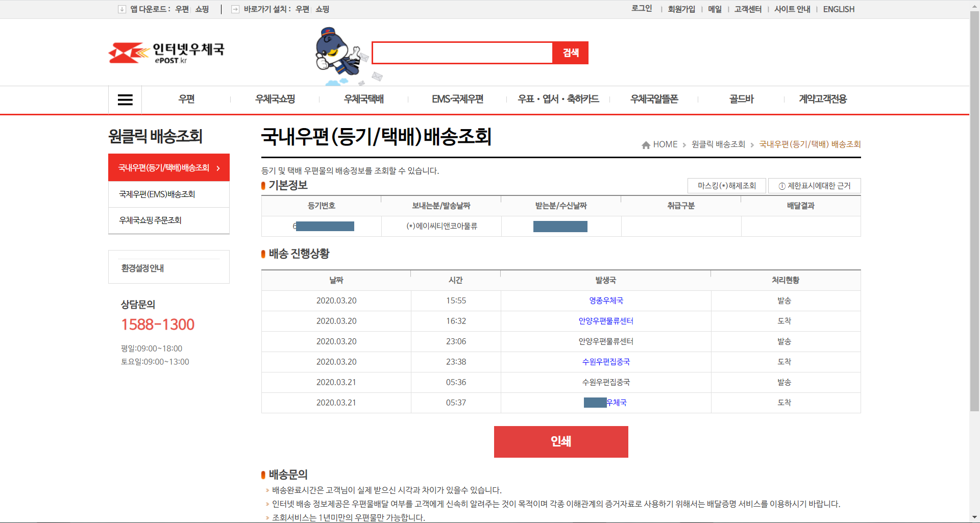 그리고 인터넷우체국 홈페이지에 들어가서 국내우편(등기/택배) 배송 조회에 들어간 다음 등기번호로 검색을 했다.