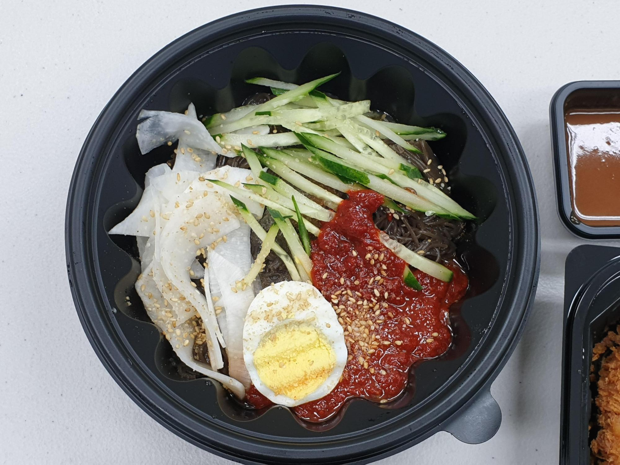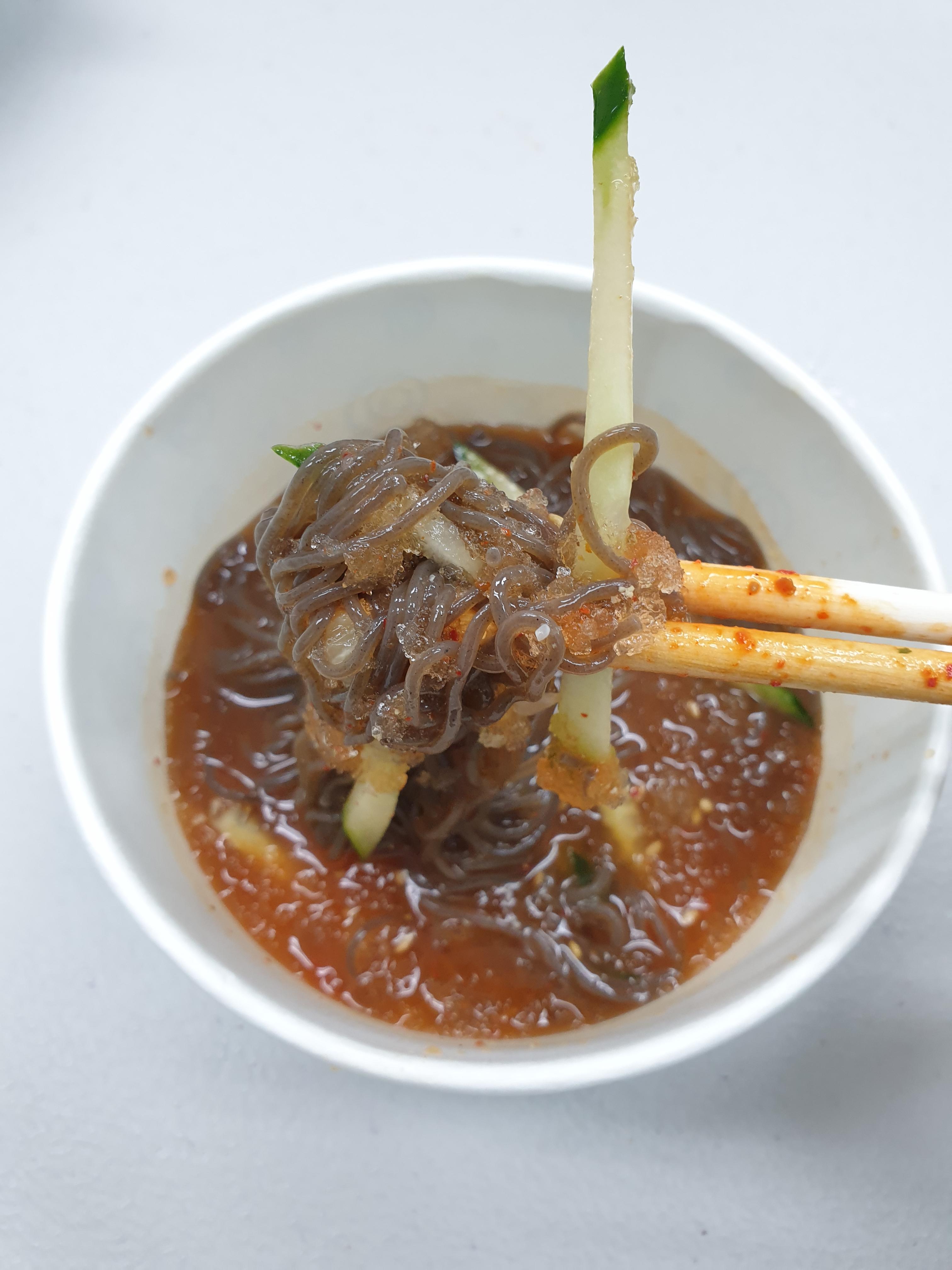 적당히 매콤하면서 새콤한 소스에 오이, 절임무와 칡냉면이 궁합이 잘 맞는다.