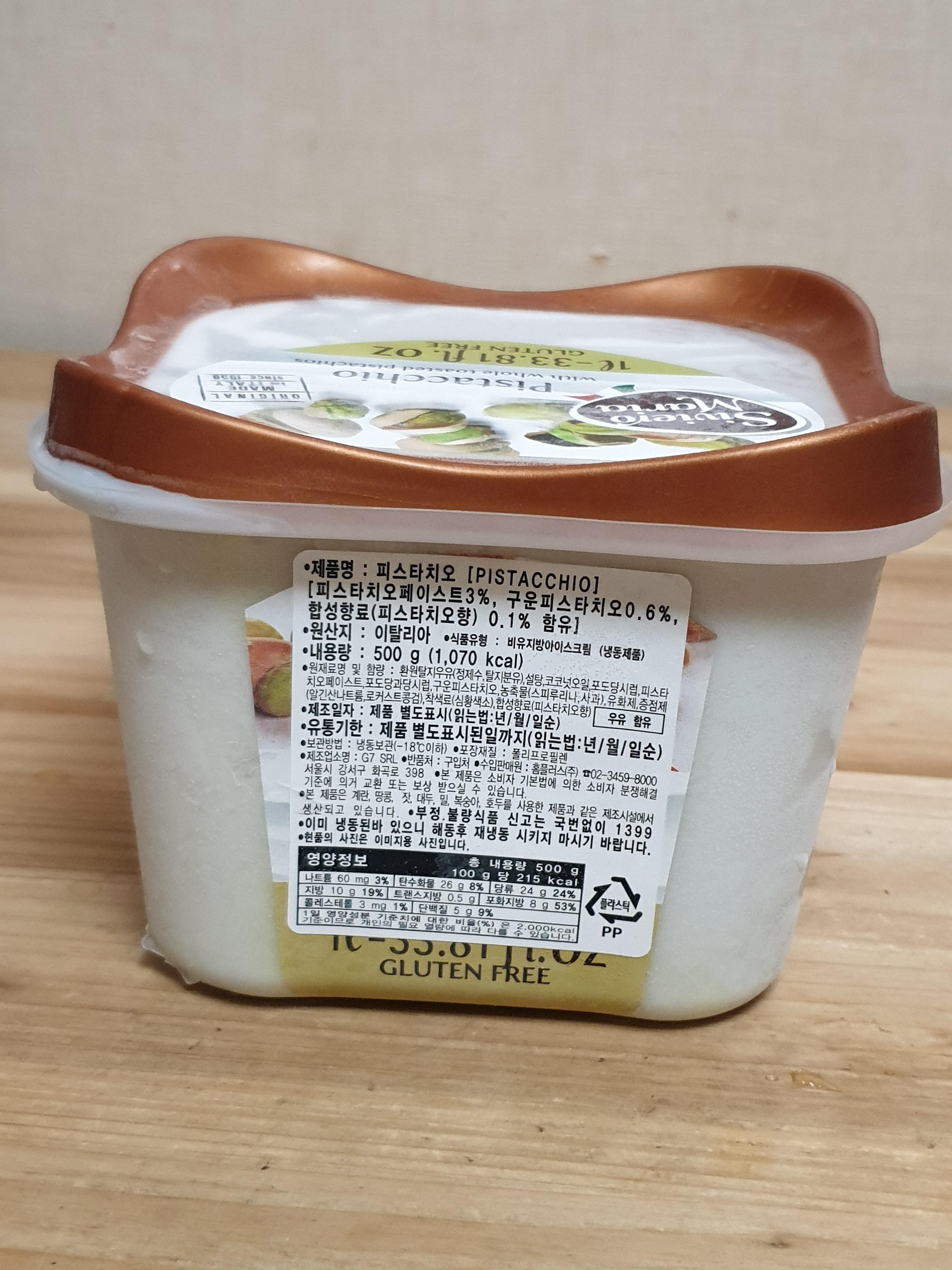 겉에 적힌 내용을 보니까 피스타치오 페이스트 3%, 구운 피스타치오 0.6%, 합성향료(피스타치오 향) 0.1%가 들어있다고 하네