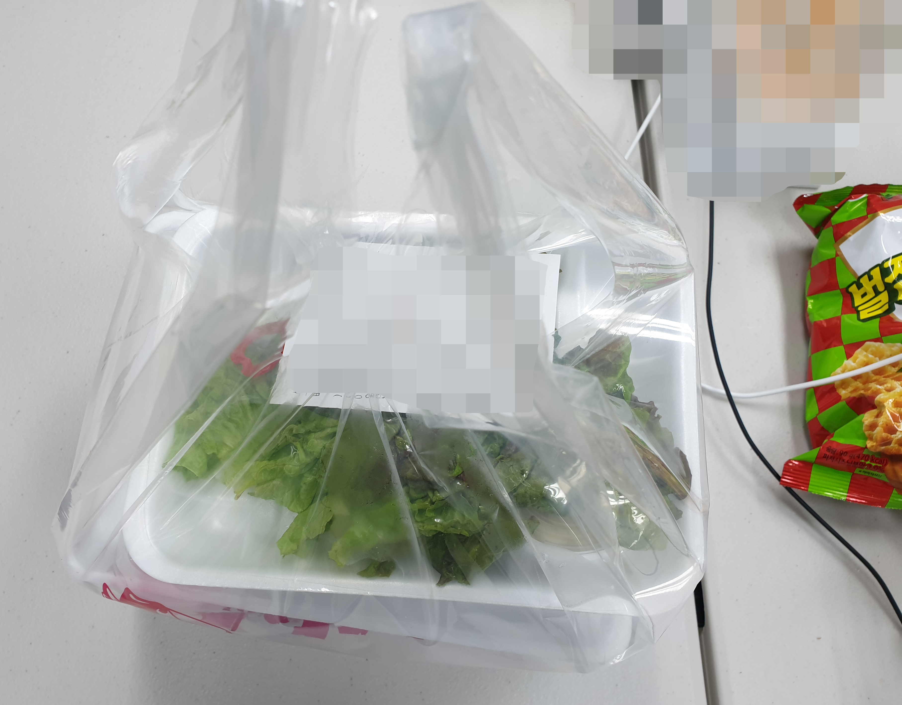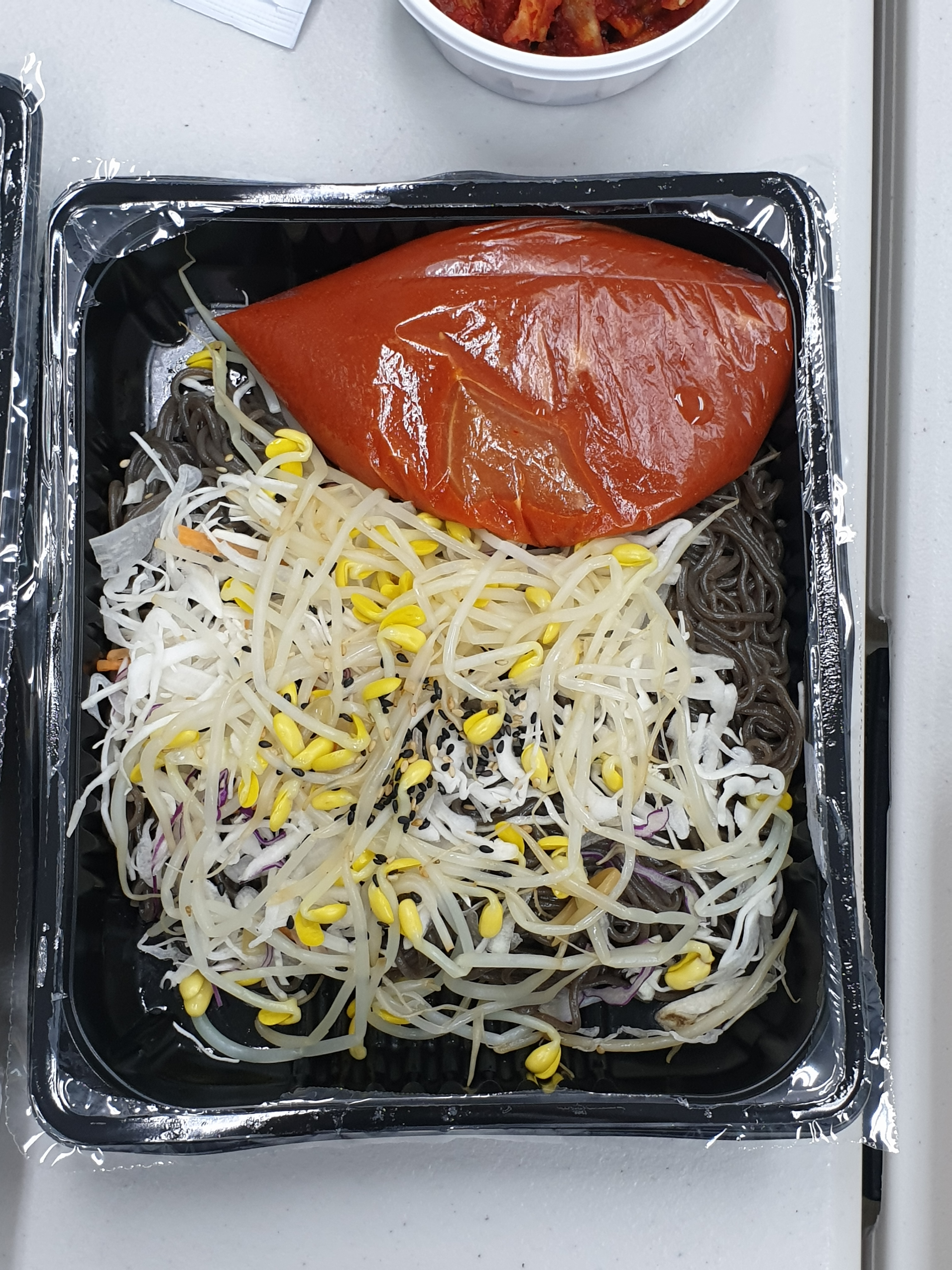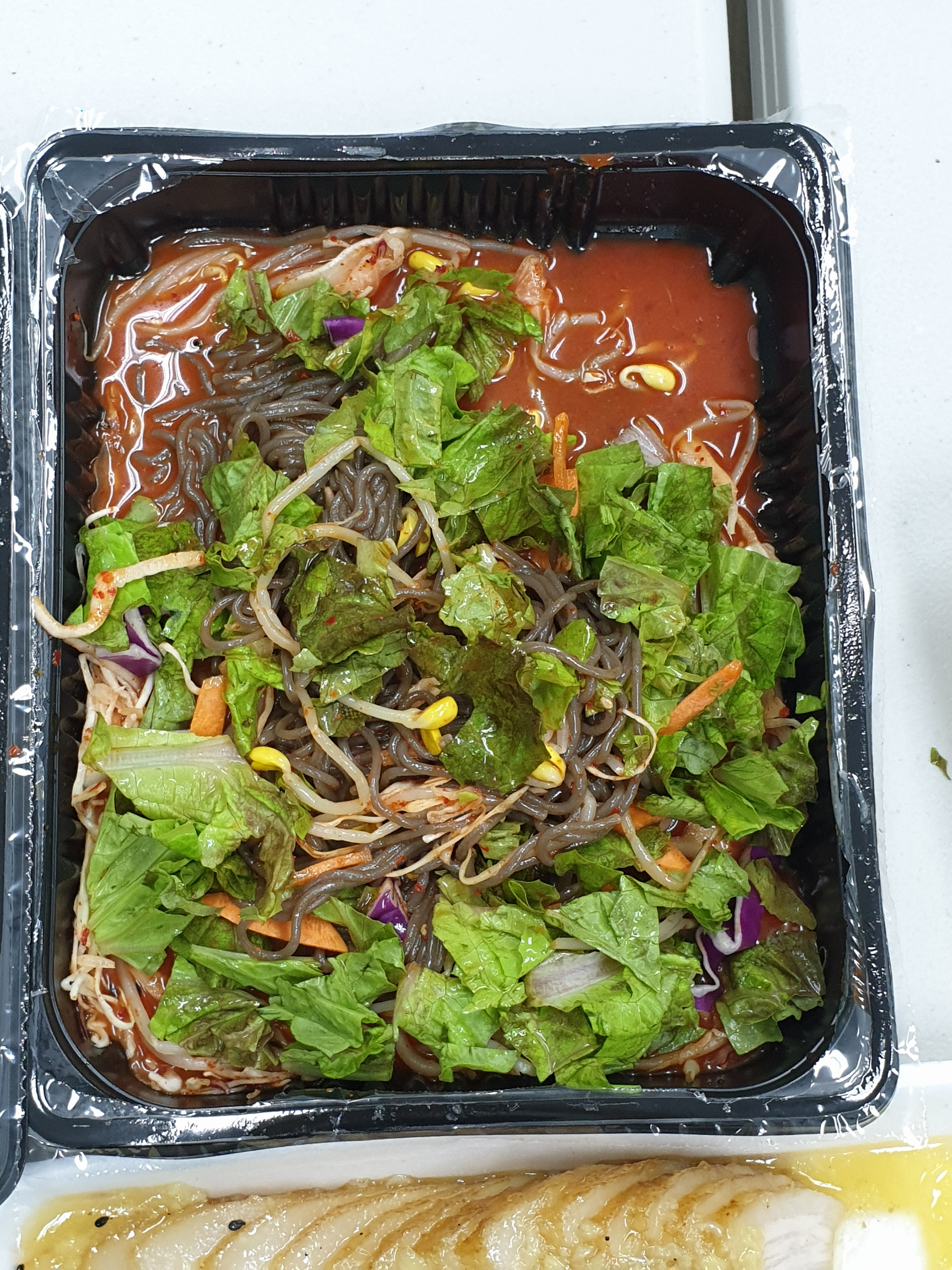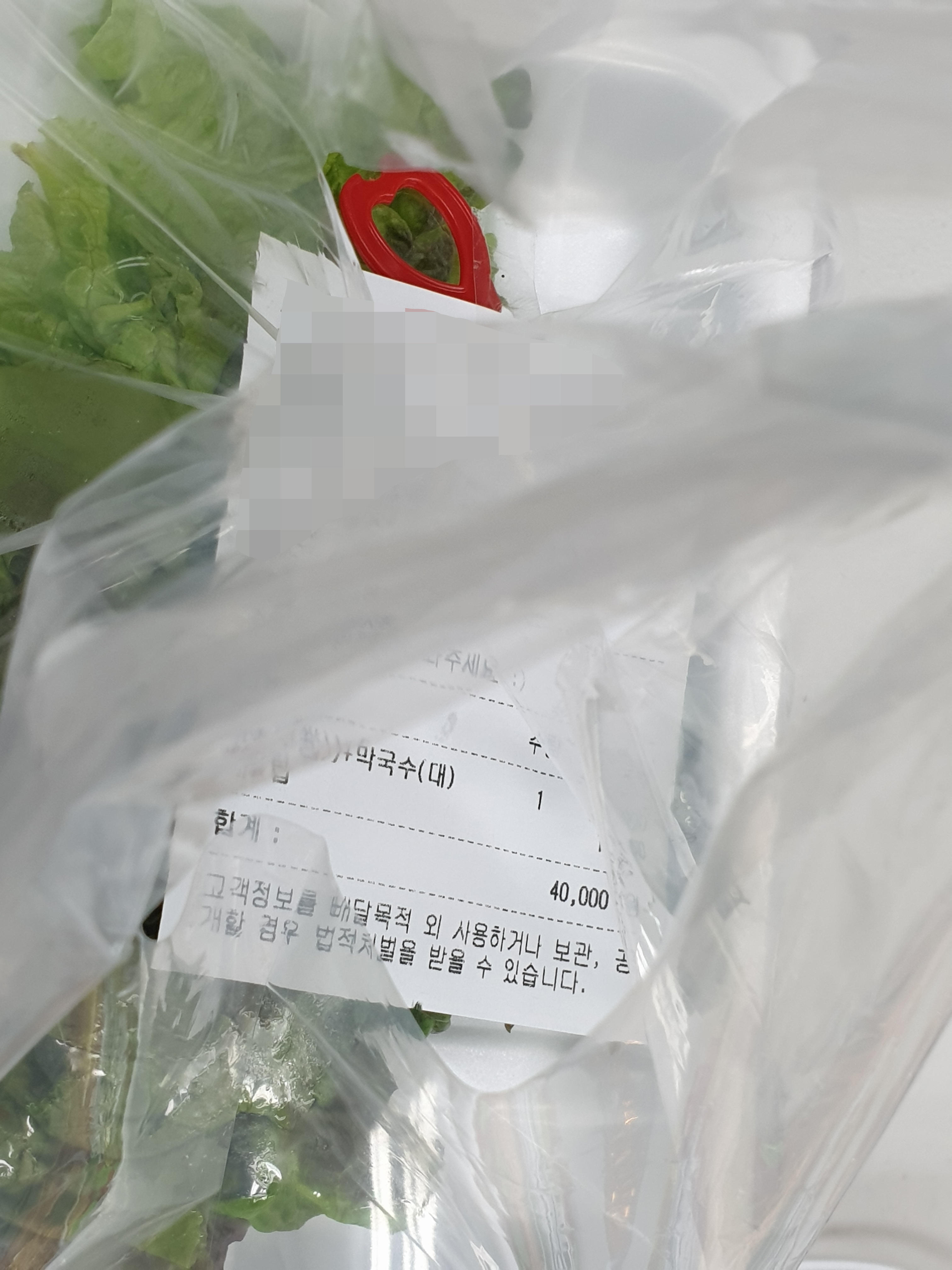 그런데 먹다 보니까 한가지 실수한게 소스와 물김치가 담겨 있는 통에 상추가 썰린 게 있었는데 보니까 이걸 막국수에 섞어 먹는 거더라구