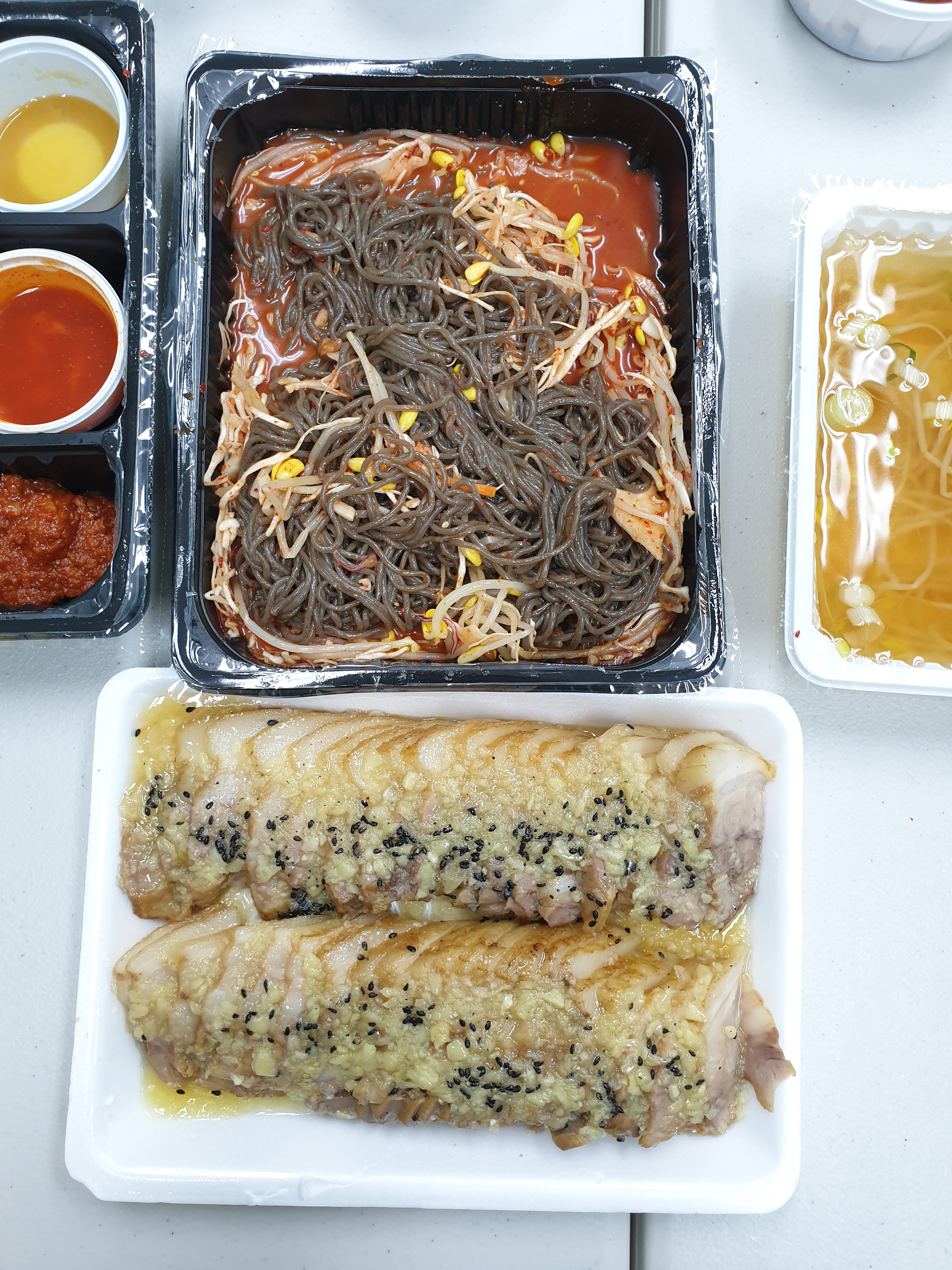 열어 보니까 시원한 콩나물국, 상추, 부추무침, 무생채(+무말랭이) 무침과 메인 메뉴인 마늘보쌈과 막국수 대짜가 있더라