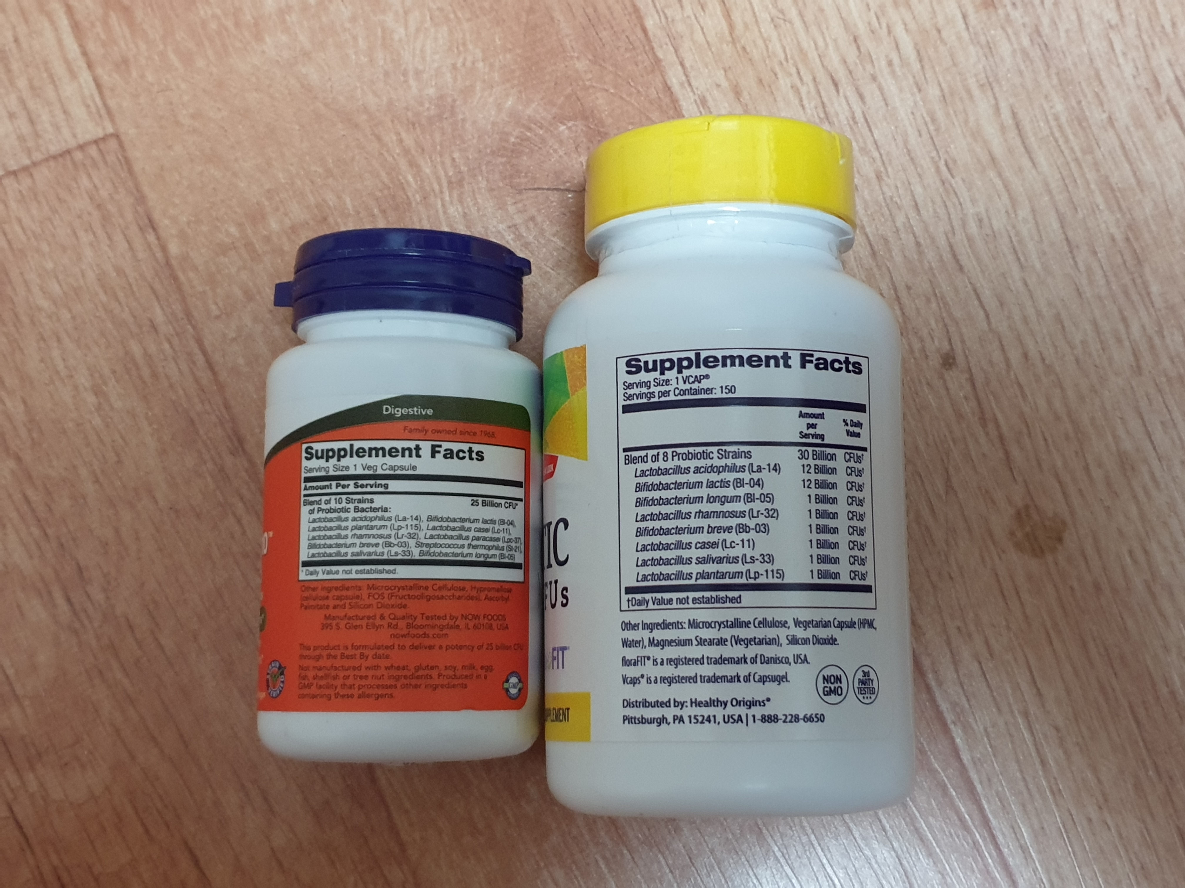 왼쪽 나우푸드의 유산균 250억은 뚜껑을 열면 약간 붉은 캡슐이 있고 오른쪽 헬씨오리진스의 유산균 300억 뚜껑을 열면 처음엔 솜이 있고 그 안에는 흰색 캡슐이 있다.