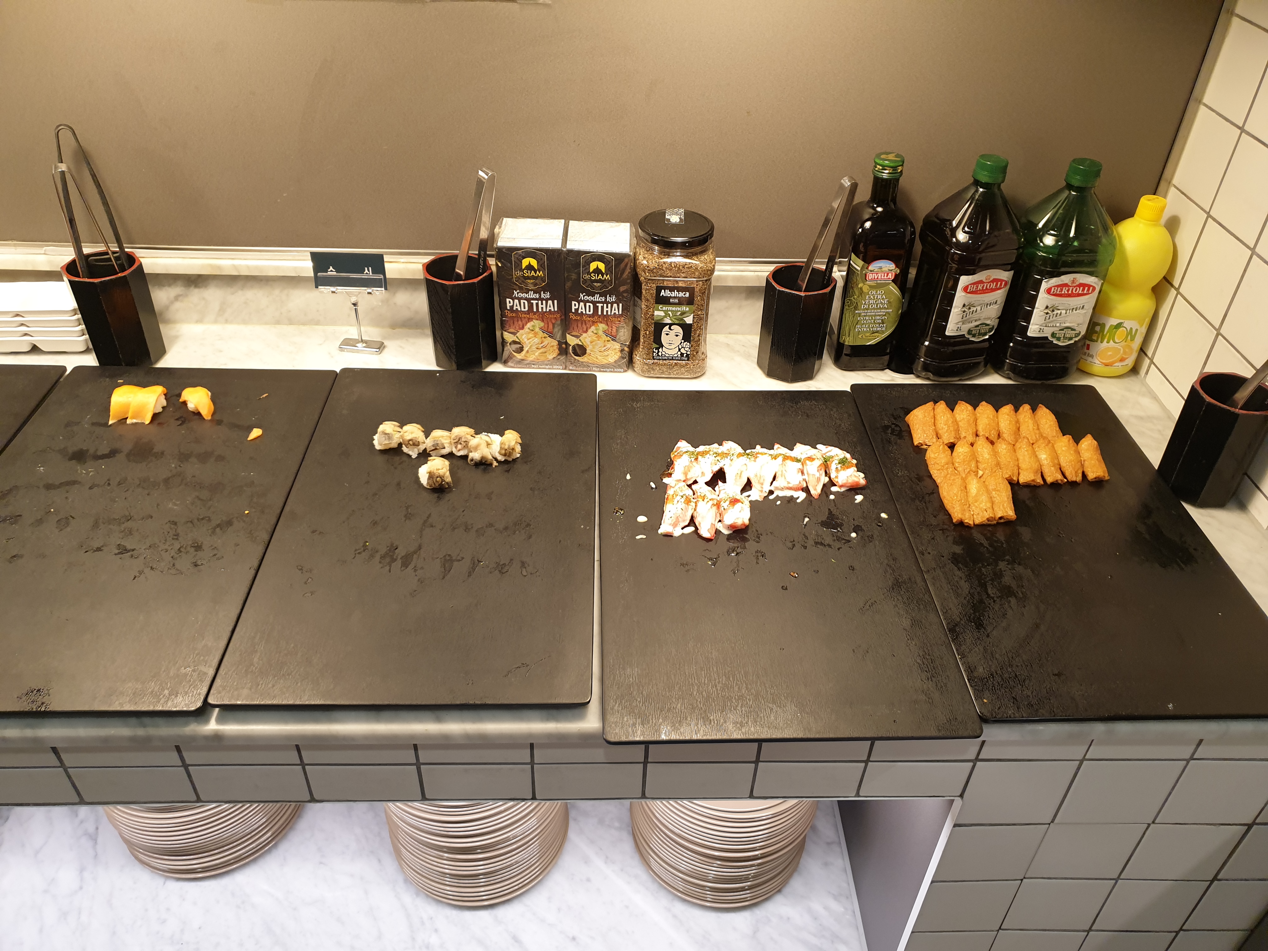 게맛살, 연어, 유부 소라 초밥과 각종 롤 초밥 등이 있다.