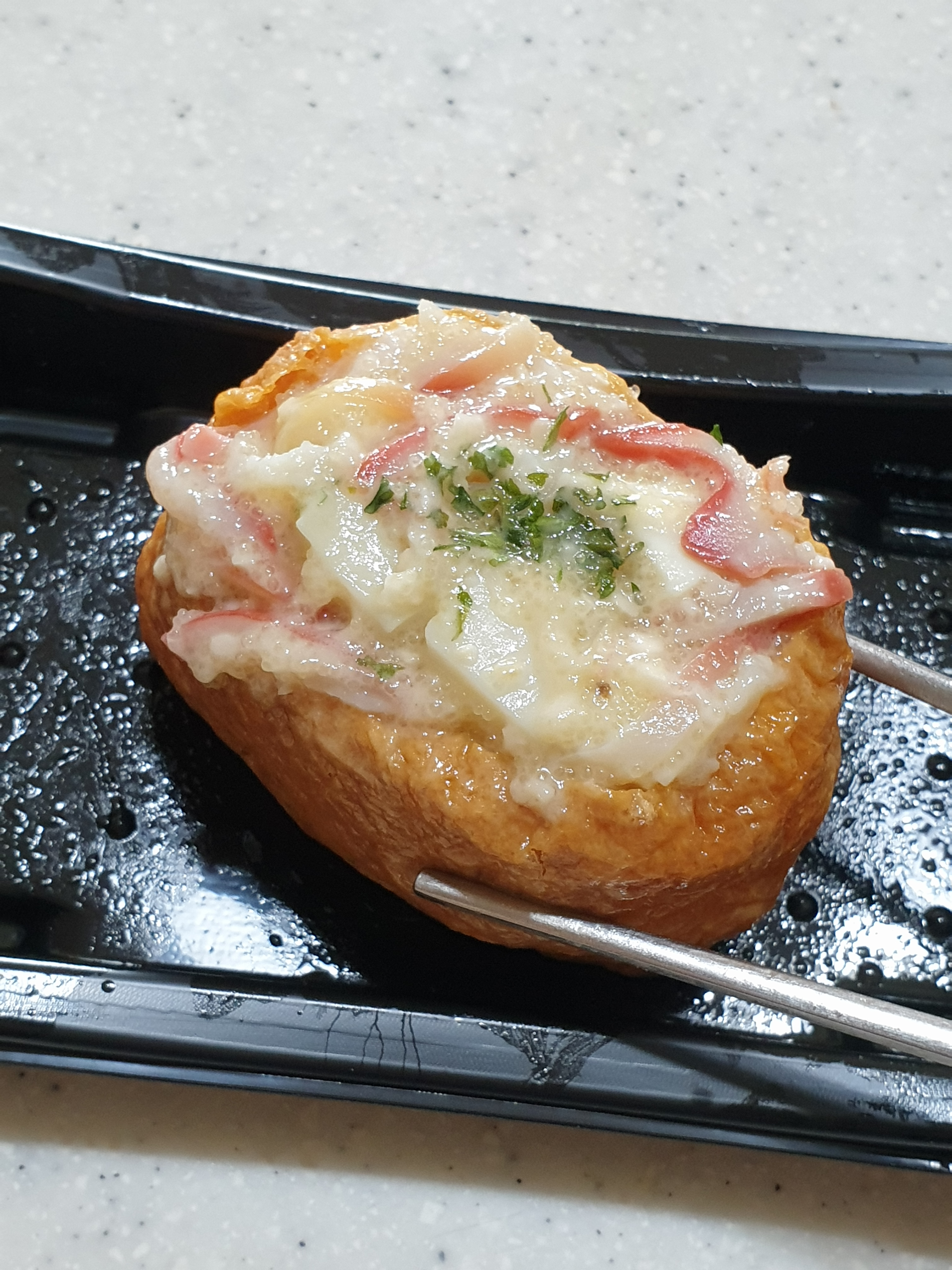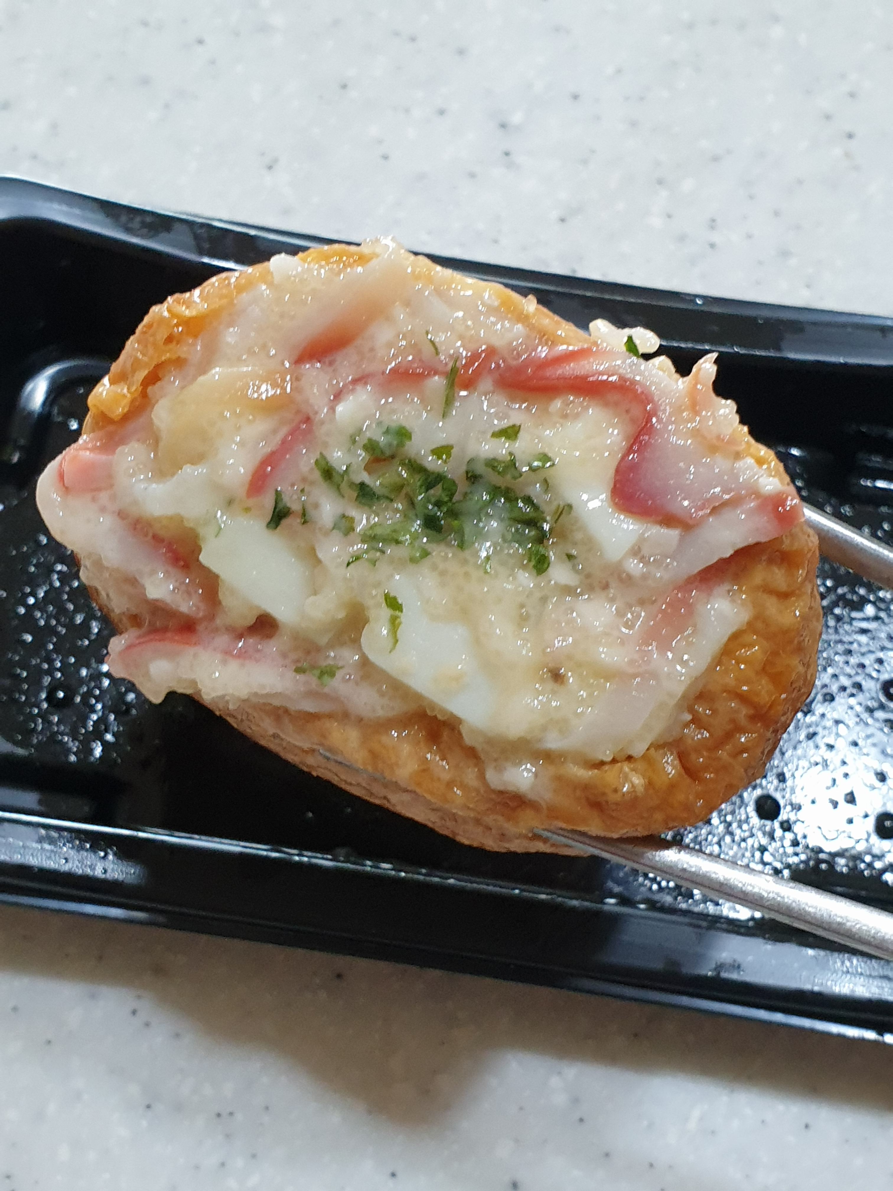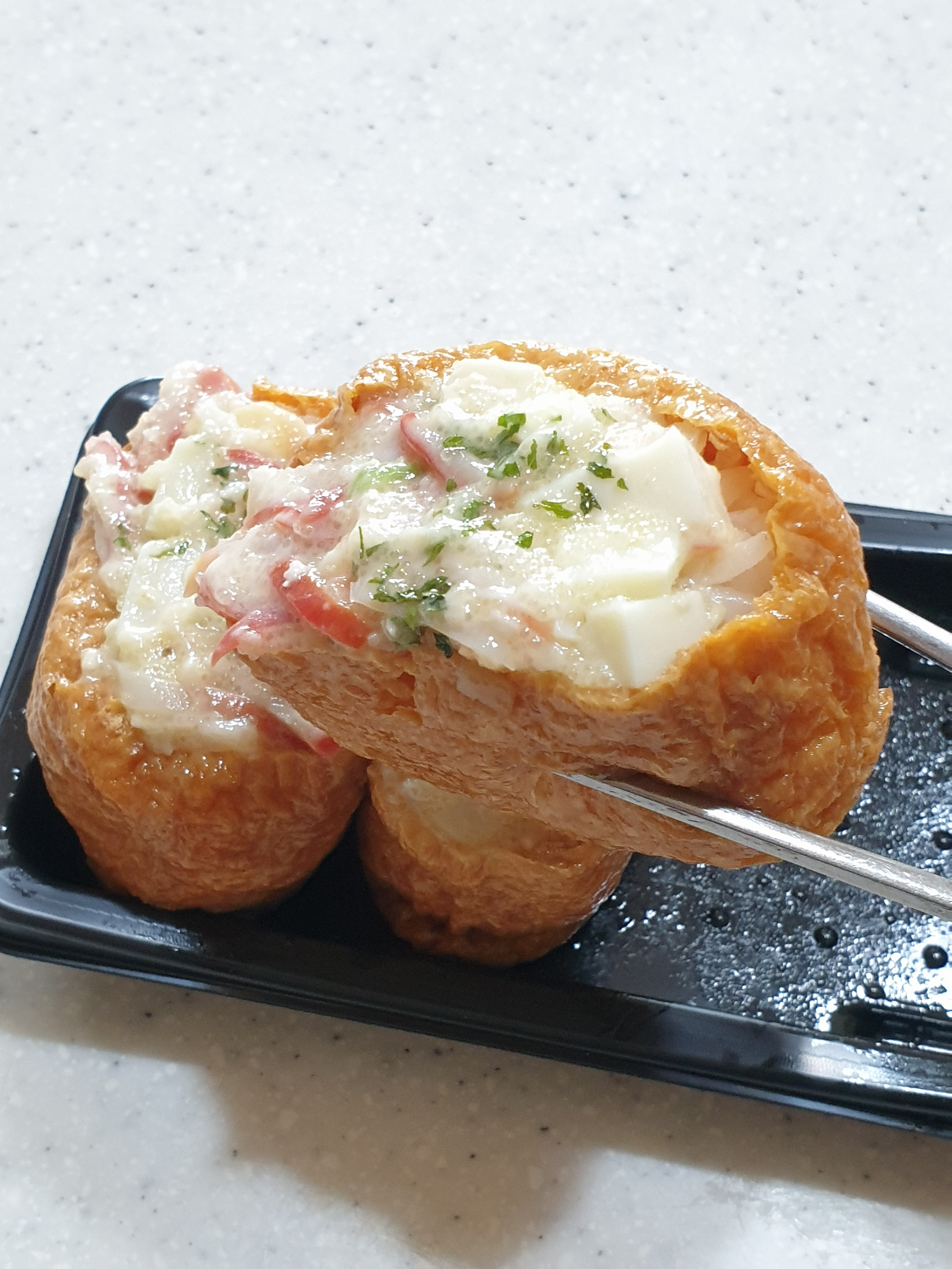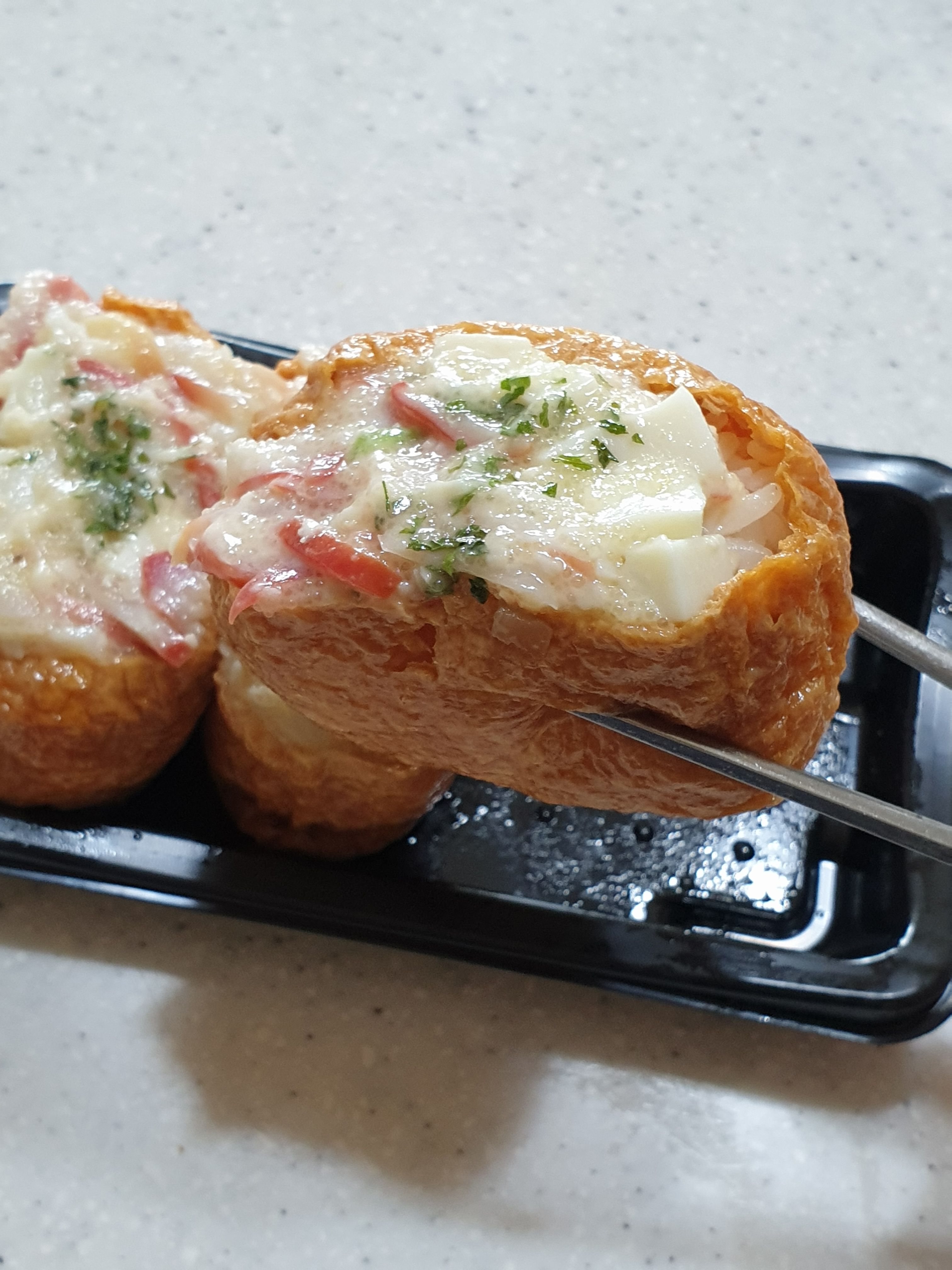보니까 유부초밥인 거 같은데 위에 북방조개 + 사라다를 올렸네