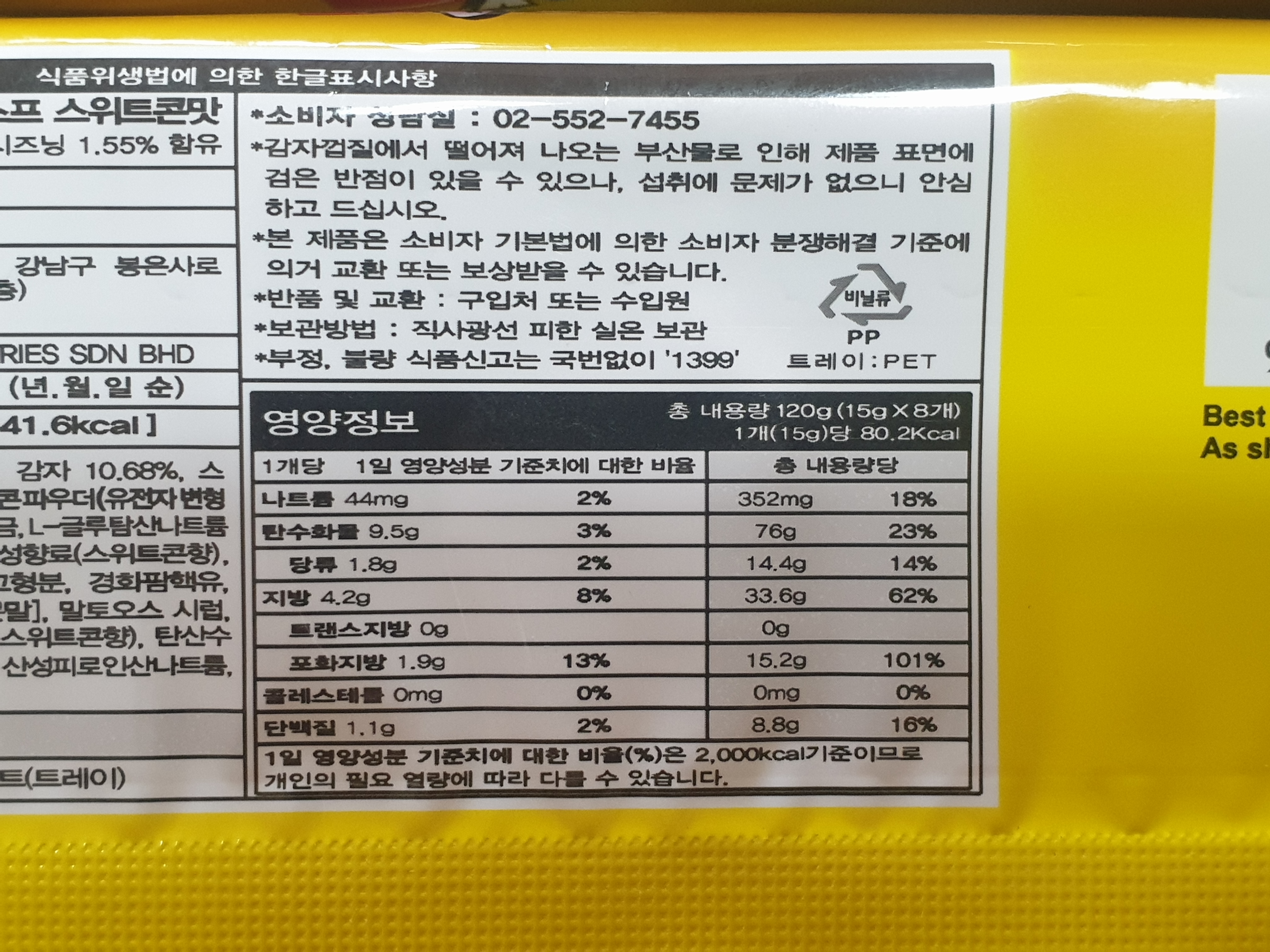 스위트 콘 맛은 총무게 120g, 641.6칼로리