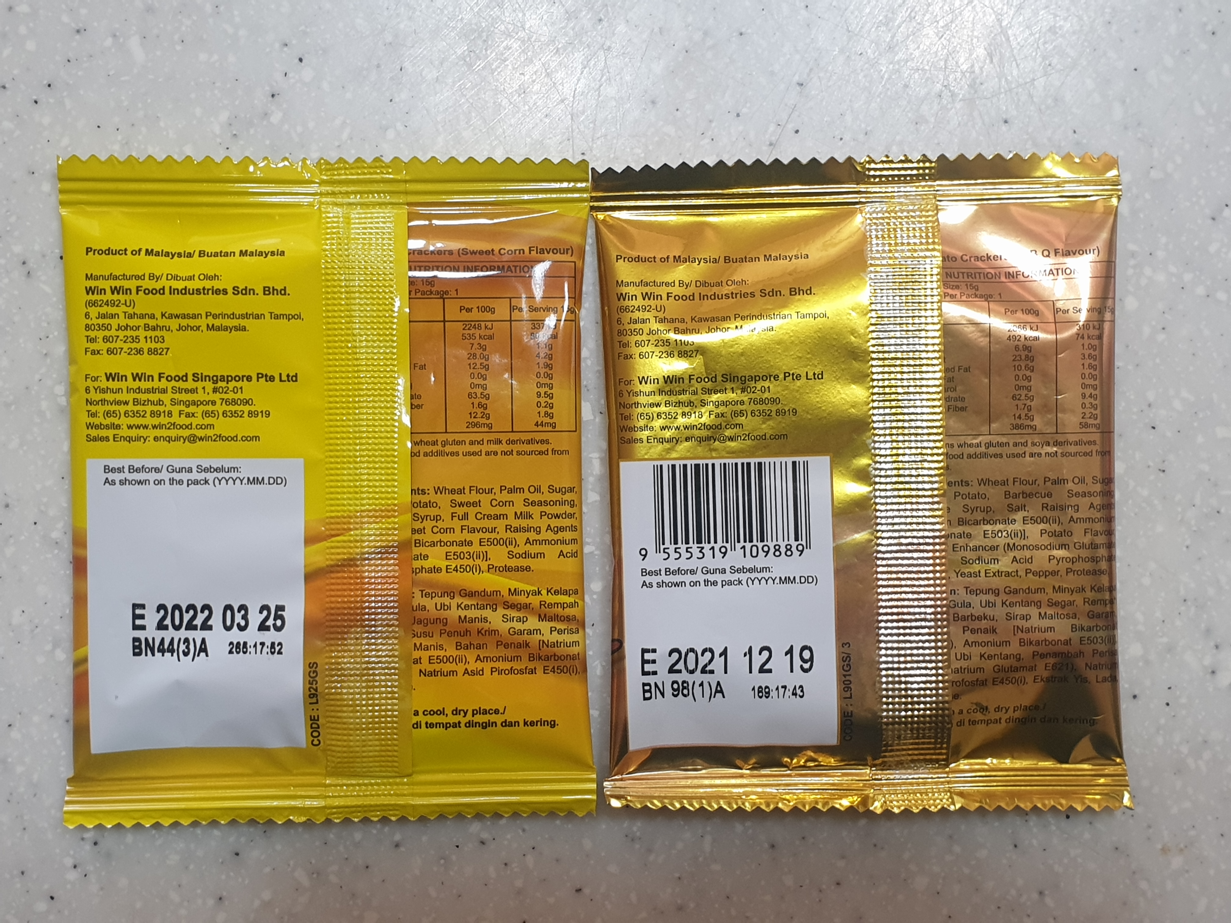 바비큐 맛, 스위트 콘 맛 둘 다 포장은 비슷한데 스위트 콘 맛 포장이 밝은 색이라면 바비큐 맛 포장은 살짝 어두운 색